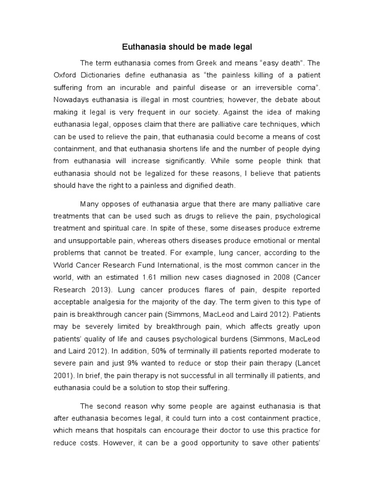 · Euthanasia is basically described as the intentional killing of an individual for his/her benefit, and is usually carried out because the person who dies requests for it. hile it can also be referred to as physician-assisted suicide, it's known as euthanasia because there are situations where the individual can't ask for it Euthanasia is the termination of a terminally ill person’s life in order to relieve patients of their severe and untreatable pain. It is further broken down into two types: active and passive. In this paper, I will be focusing on active euthanasia and will argue that it is morally justifiable for a physician to alleviate [ ] · Essay Sample on Euthanasia Euthanasia is the practice of ending the life of a patient to limit the patient’s suffering. The patient in question would typically be terminally ill or experiencing great pain and suffering. The word “euthanasia” originated from the Greek words “EU” (good) and “Thanatos” (death)